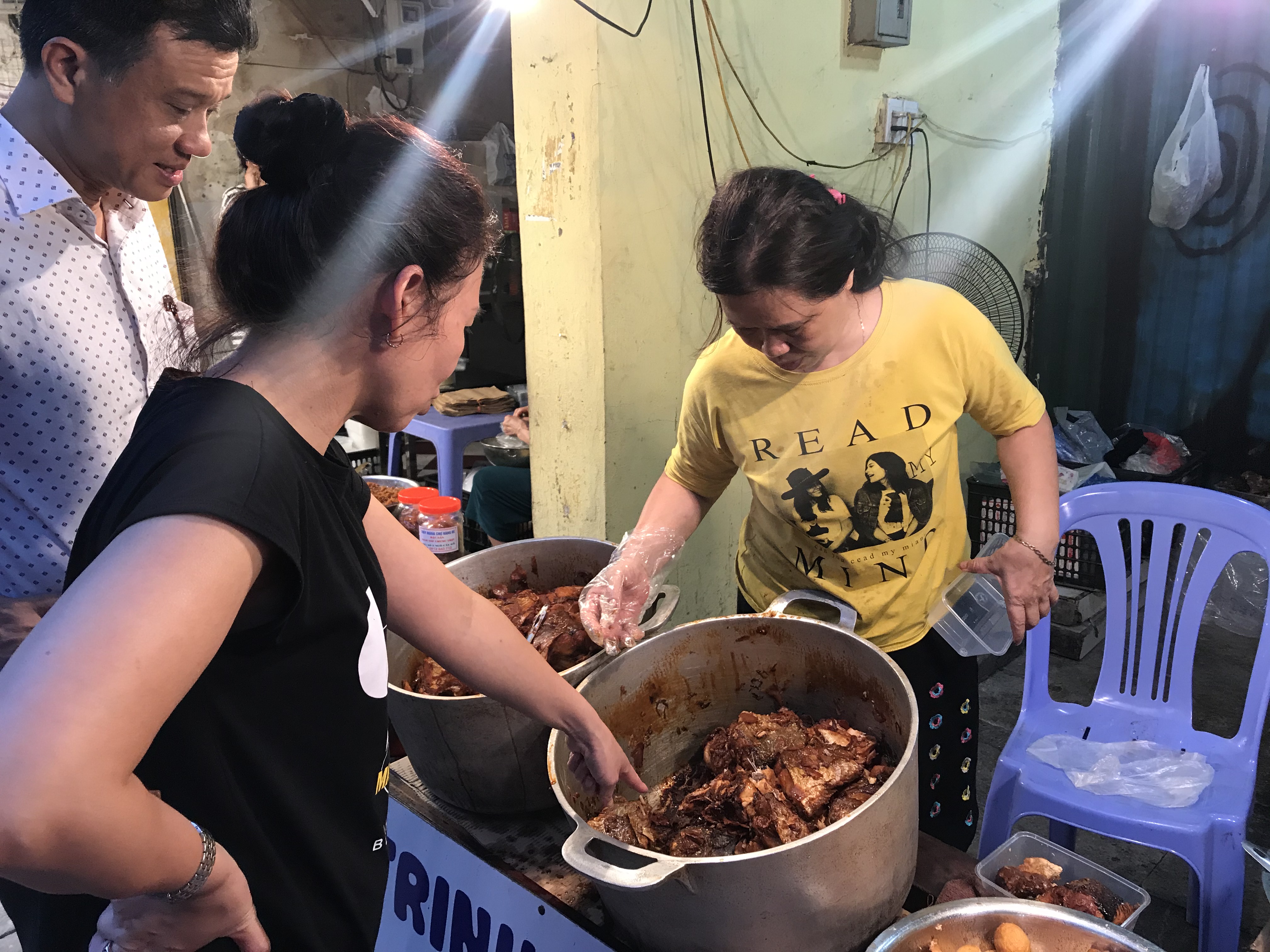 Cada tarde, cuando las mujeres regresan a casa después de un día laboral para preparar la comida familiar, la tienda de la señora Trinh está llena de clientes. Se trata de un tenderete instalado en la acera de una casa de solo un piso en la cual se encuentran varias mesas de plástico con grandes ollas con comida. Ni llamativo ni lujoso, pero el lugar es el preferido de muchas amas de casa, una de ellas la señora Tuyen comentó: “He sido cliente fiel de este restaurante por varios años. Me encanta el sabor tradicional del estofado de pescado aquí. La carne de pescado es firme, lisa pero no triturada. Incluso se pueden comer ingredientes del plato, como raíz de galanga cortada en trozos mientras la salsa es deliciosa y atractiva con un color marrón amarillento”.