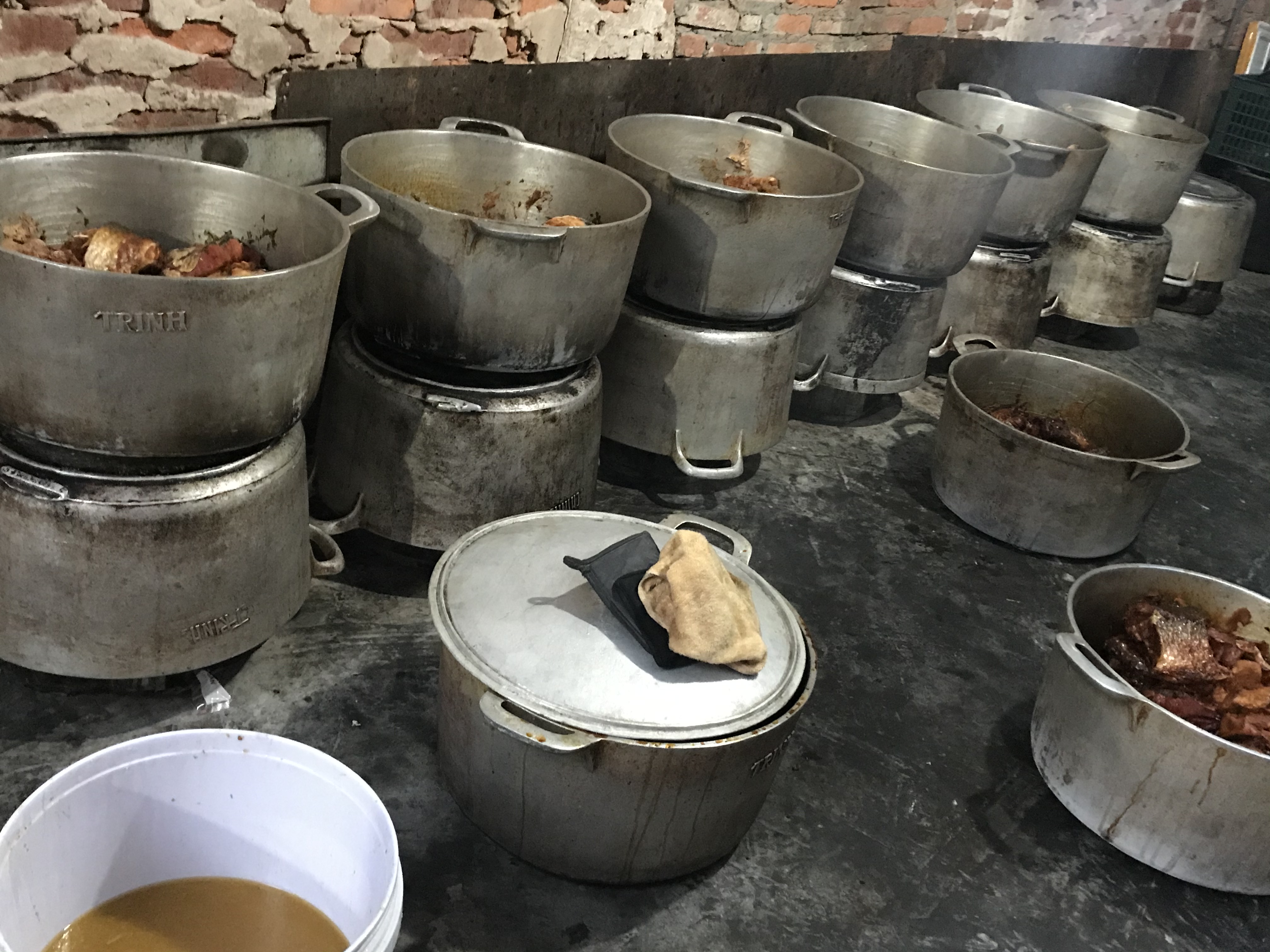 Detrás de la tienda se encuentra una larga fila de estufas de carbón, sobre las cuales hay enormes ollas de pescado que están humeando. La señora Trinh instruye a su personal cómo controlar el fuego para asegurar la jugosidad del alimento. Un aroma exquisito que se eleva desde las ollas del estofado seduce a cualquier visitante.