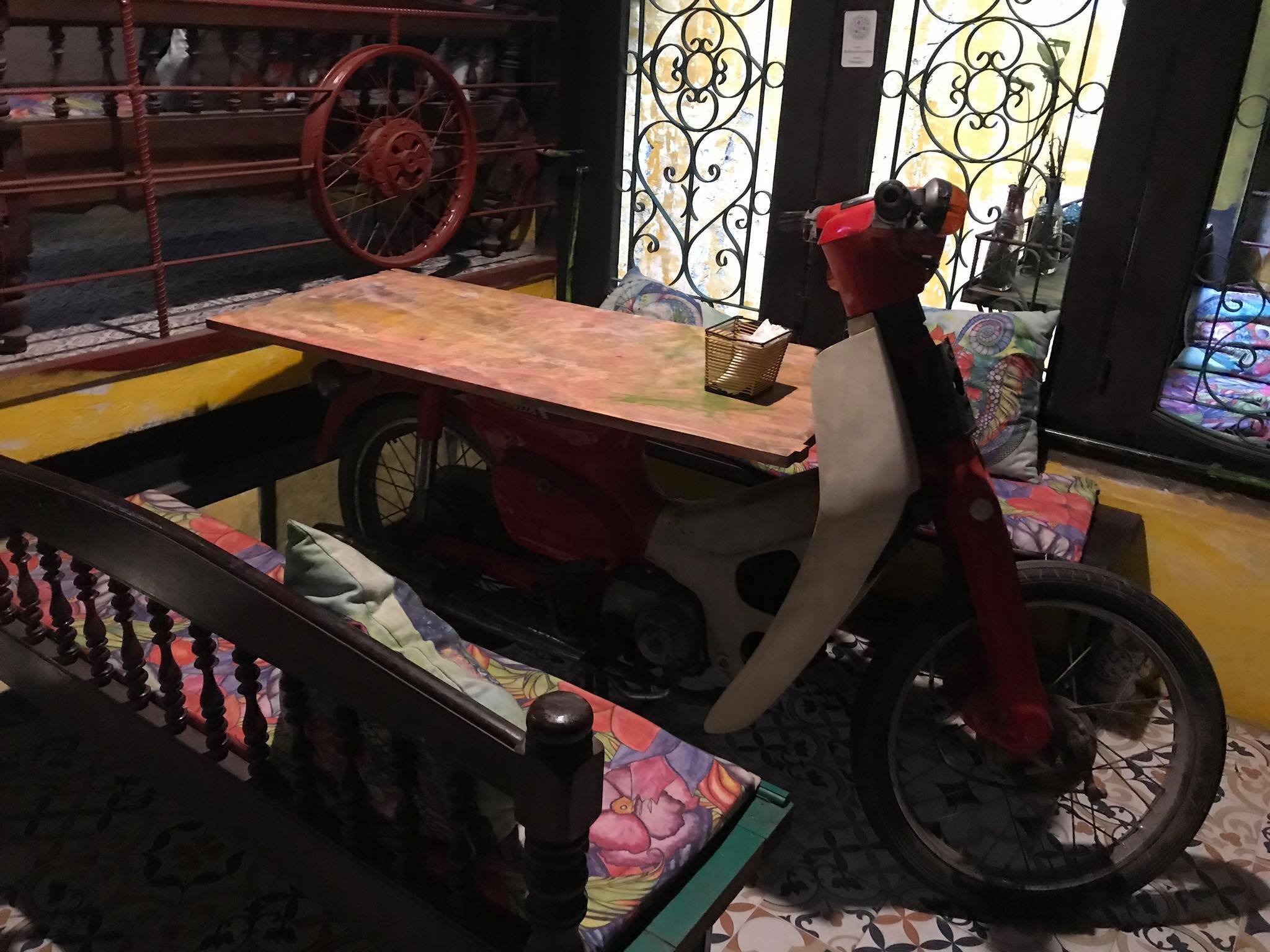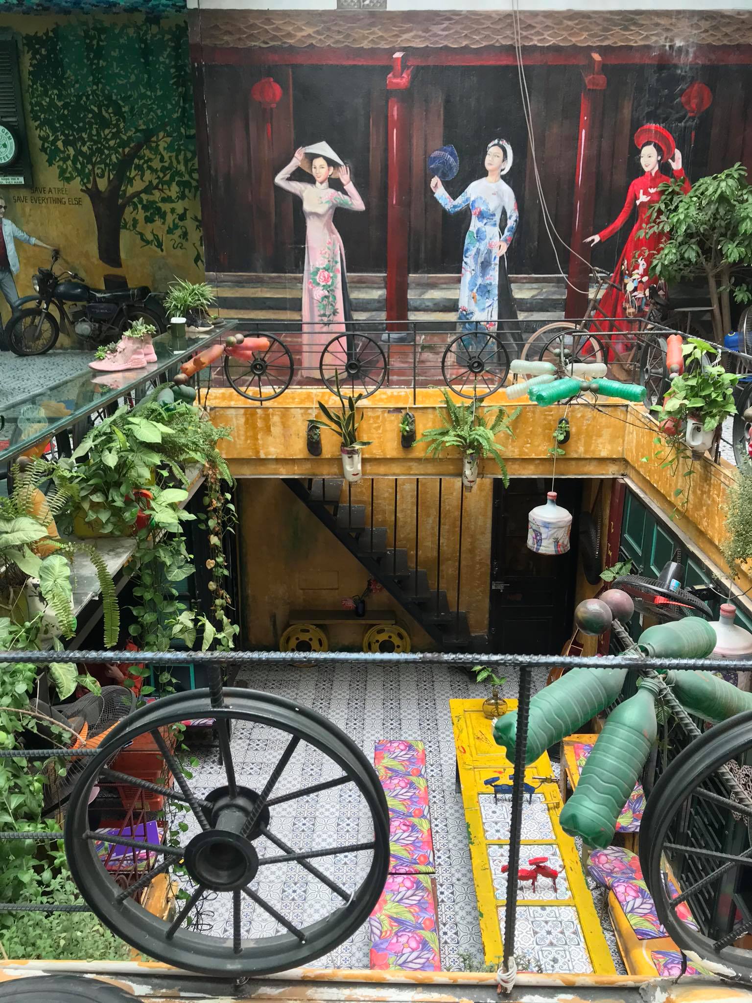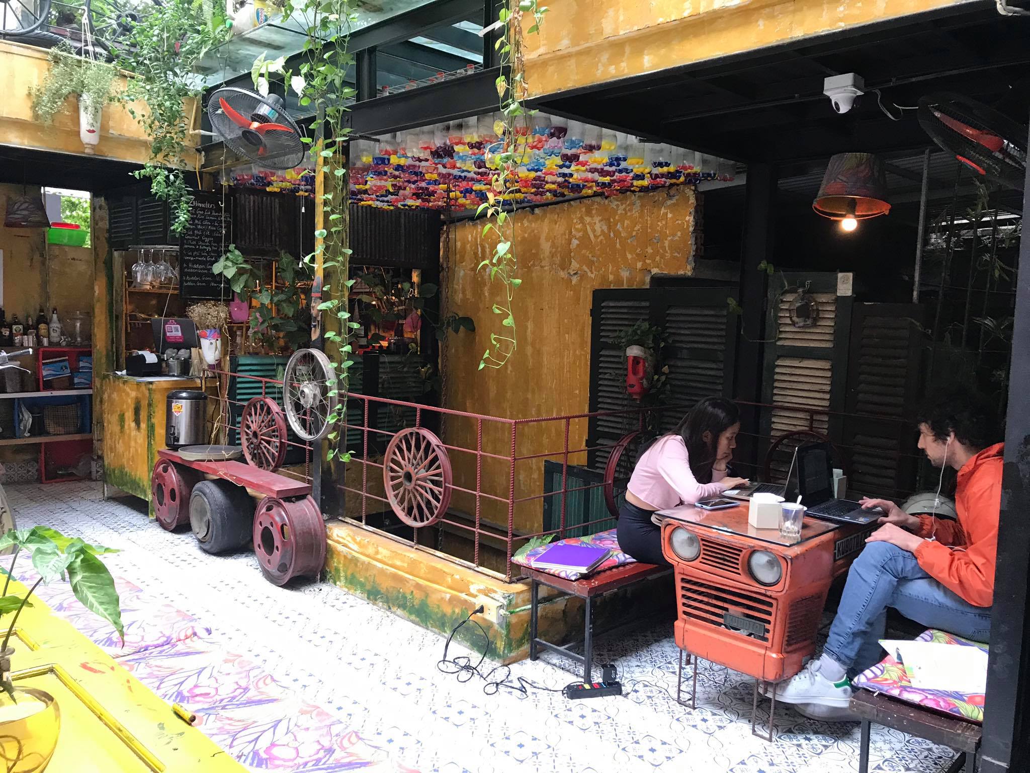 Al entrar en la cafetería “Hidden Gem”, los clientes experimentan la sensación de asistir a un espacio, aunque no demasiado grande, pero “llamativo” debido a su estilo único de decoración. Los artículos que adornan el lugar han sido elaborados íntegramente a partir de materiales reciclados y hábilmente instalados y repartidos por los tres pisos de una casa ubicada en el Casco Antiguo de Hanói. Entre los materiales reciclados destacan piezas de automóviles, cabezas de tractores, llantas de motocicleta y puertas de madera, incluso una lámpara de techo hecha con botellas viejas en combinación con llantas de motos. Además, se puede encontrar bancos de madera, cubiertos con cojines de flores rojas, fusionados con la superficie de una mesa saliente del asiento trasero de una motocicleta vieja.