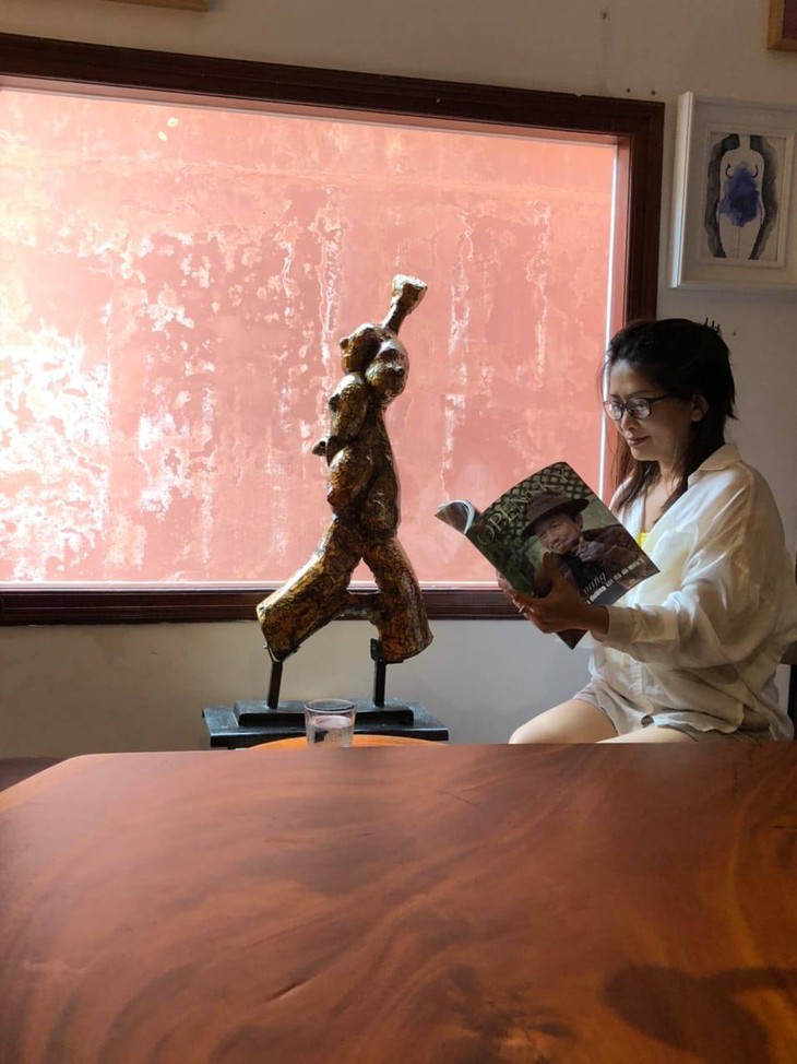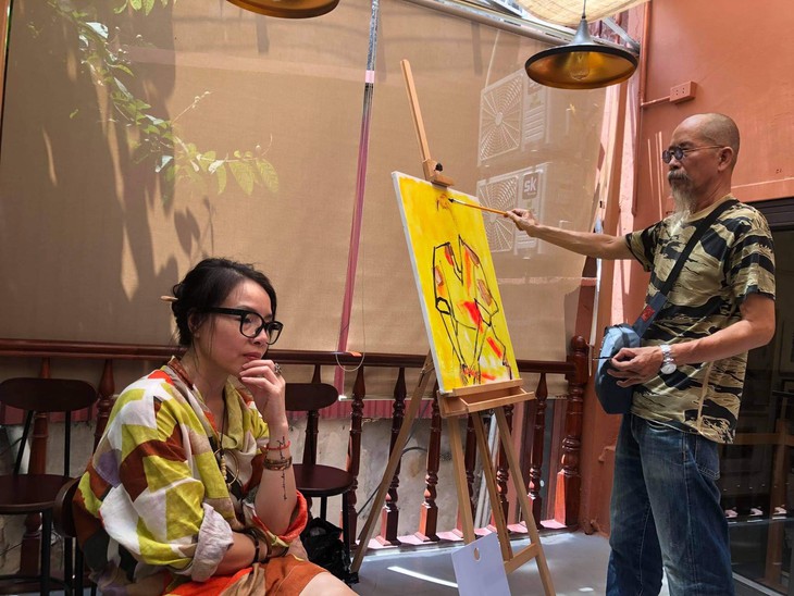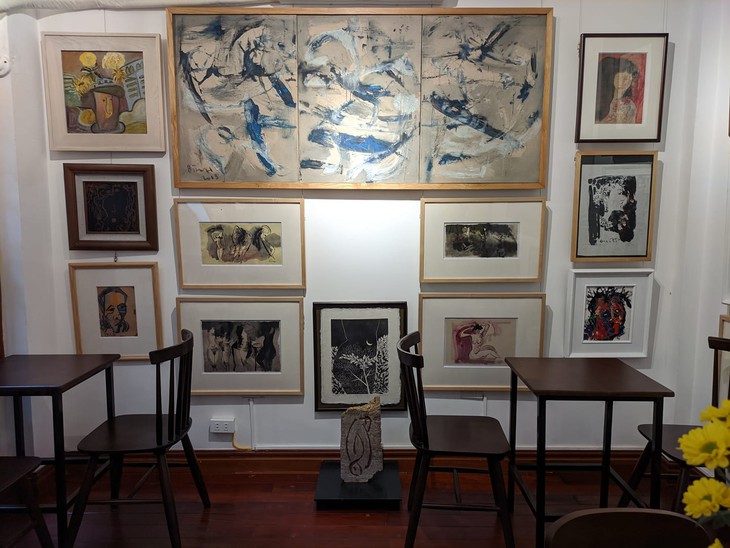 Si uno viene solo, puede quedarse en la planta baja para disfrutar de una taza de café o un vaso de zumo de frutas, cuyo sabor le complacerá. Pero, quizás también tenga la oportunidad de conocer a uno o más pintores que exponen sus obras en la cafetería. My Ngoc es una de esos artistas.