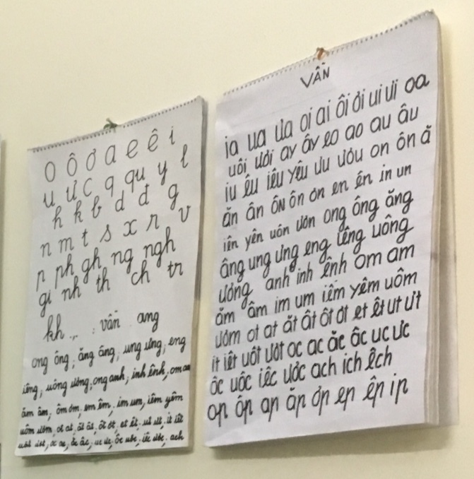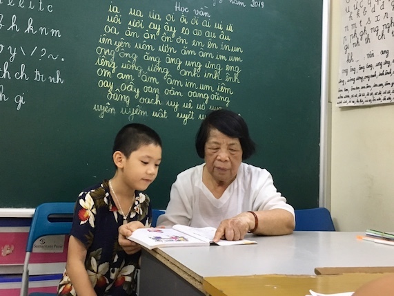 La señora Nguyen Thi Coi está enseñando a un niño a deletrear |