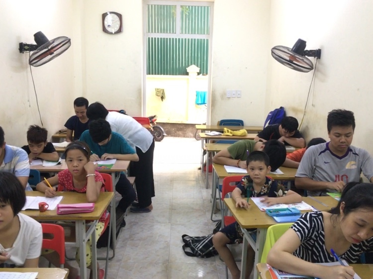 La clase ocupa un espacio de aproximadamente 40 metros cuadrados, se llama “Aula Flexible” y está en el distrito capitalino de Hoang Mai. Más de 20 estudiantes, el menor de 12 años y el mayor de 29, escuchan atentamente mientras la maestra Nguyen Thi Coi da lecciones sobre ortografía. Durante 3 horas, de las 8 hasta las 11 de la mañana, la anciana maestra de 79 años, con cabello corto y rizado y ropa sencilla, escribió las letras en la pizarra y enseñó a sus alumnos a deletrear palabras. A veces, tomaba con dulzura la mano de un nuevo alumno para enseñarle amablemente a escribir cada letra, a realizar un ejercicio de matemáticas o para consolarlo en su llanto.