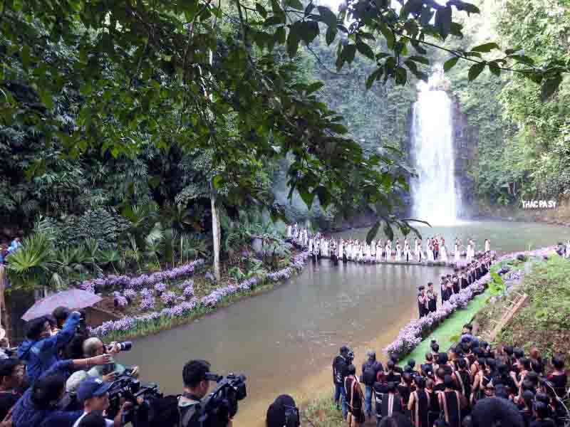 Desfile de moda de Ao dai y brocado de las Tierras Altas Centrales en la cascada de Pa Sy, distrito de Kon Plong. |