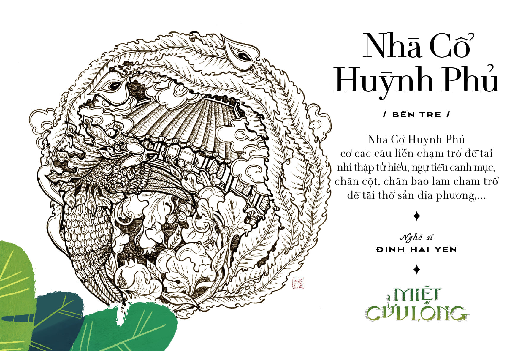 Cada artista presentó tres pinturas. Los jóvenes estudiaron la historia y el significado cultural de cada sitio para resaltar sus características más distintivas. Por ejemplo, la Aldea turística de Tan Thuan Dong constituye uno de los destinos más atractivos en la provincia de Dong Thap por su enfoque al ecoturismo. En este caso, la ilustración del lugar denota el aire fresco de ese pueblo mediante la imagen de un chico llevando una bicicleta mientras atraviesa un jardín lleno de frutas y alrededor de él se ven varios botes característicos del oeste. En otro dibujo sobre la provincia de Ben Tre, veremos un lugar que existió hace 131 años: la antigua casa de Huynh Phu. La artista logra describir la antigüedad de la vivienda sólo con la utilización de blanco y negro. Un fénix vuela alrededor de la casa.