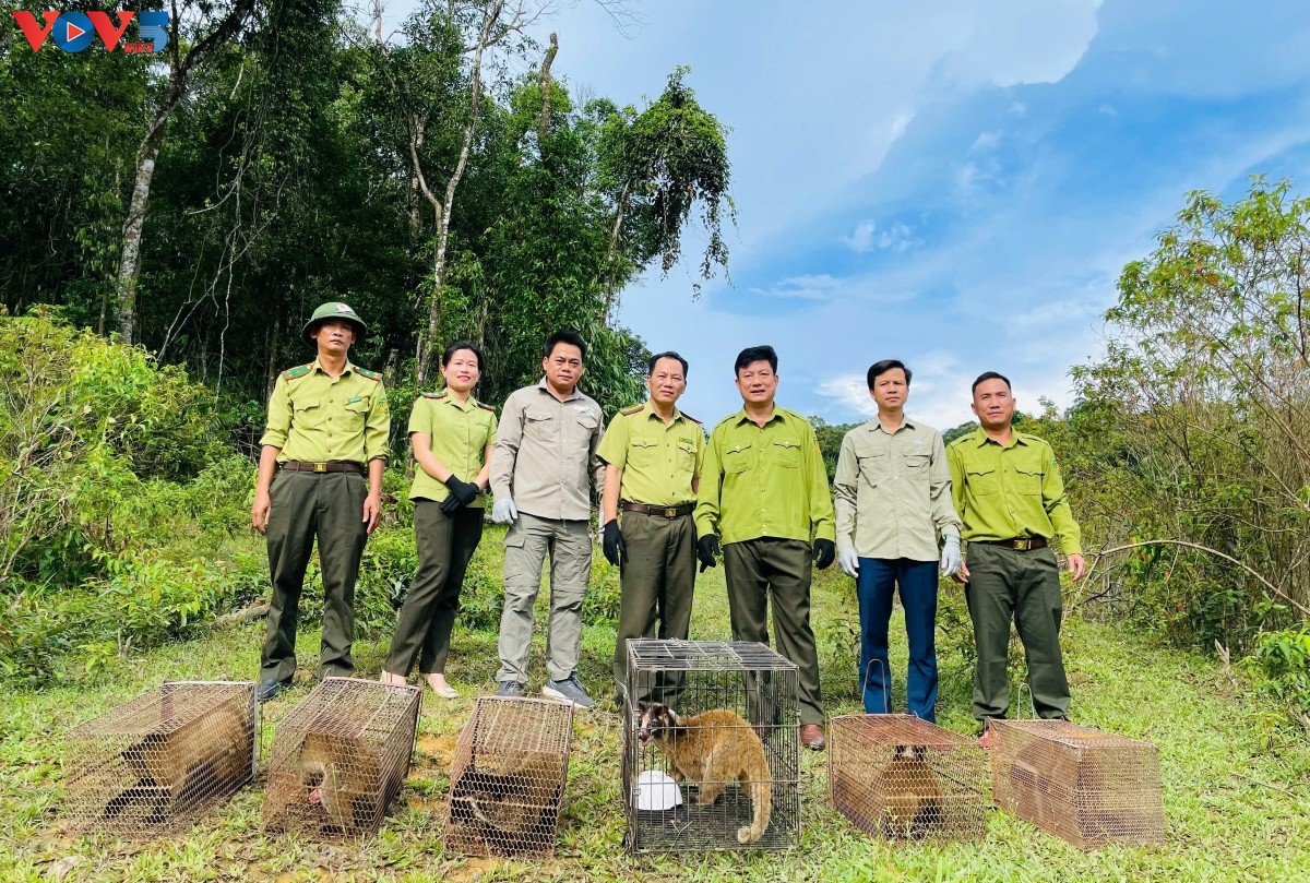 El personal del Parque Nacional Vu Quang se prepara para regresar animales salvajes salvados de redes de tráfico ilegal a su entorno natural. (Foto: VOV) |