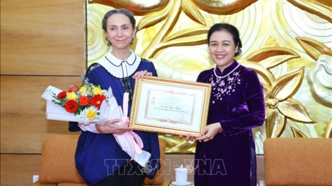 (VOVWORLD) - La presidenta de la Unión de Organizaciones de Amistad de Vietnam (VUFO), embajadora Nguyen Phuong Nga, entregó el 23 de noviembre en Hanói el sello conmemorativo "Por la paz y la amistad entre los pueblos" a la embajadora de México en Hanói, Sara Valdés Bolaño.