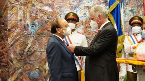 (VOVWORLD) - Tras finalizar las conversaciones oficiales, el presidente de Cuba, Miguel Díaz-Canel, presidió una ceremonia de entrega de la orden José Martí, la más alta condecoración del Estado cubano, a su homólogo vietnamita Nguyen Xuan Phuc, en la tarde del 19 de septiembre en La Habana.