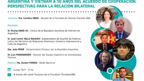(VOVWORLD) - Un coloquio denominado “Argentina y Vietnam a 10 años del acuerdo de cooperación: Perspectivas para la relación bilateral” tuvo lugar el 13 de julio por la plataforma Zoom y se transmitió en vivo en el canal de Youtube de la Facultad de Ciencias Sociales de la Universidad de Buenos Aires.