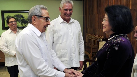 (VOVWORLD) - El general de Ejército Raúl Castro Ruz, primer secretario del Comité Central del Partido Comunista de Cuba, y Miguel Díaz-Canel Bermúdez, presidente de los Consejos de Estado y de Ministros, recibieron este martes a la vicepresidenta de Vietnam, Dang Thi Ngoc Thinh, quien realiza una visita oficial al país caribeño.