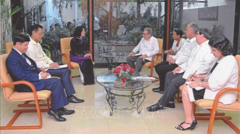(VOVWORLD) - En el marco de su visita oficial a Cuba, la vicepresidenta vietnamita, Dang Thi Ngoc Thinh, sostuvo este martes un encuentro con el primer secretario del Comité Central del Partido Comunista, Raúl Castro Ruz, y el presidente de la nación caribeña, Miguel Díaz-Canel Bermúdez.