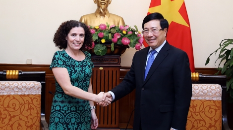 (VOVWORLD) - El viceprimer ministro y canciller vietnamita, Pham Binh Minh, recibió este 3 de abril en la sede de la Cancillería, en Hanói, a la nueva embajadora de Uruguay en el país, Rosario Portell.