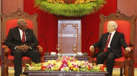 (VOVWORLD) - El secretario general del Partido Comunista de Vietnam, Nguyen Phu Trong, recibió el 13 de septiembre en Hanói al primer vicepresidente de los Consejos de Estado y de Ministros de Cuba, Salvador Valdés Mesa, quien se encuentra al frente de una delegación de su país para participar en el acto conmemorativo por el 45 aniversario de la visita del líder de la Revolución Cubana, Fidel Castro, a las zonas recién liberadas de Vietnam del Sur.