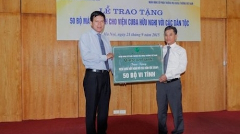 (VOVworld) - El vicedirector del Banco de Comercio Exterior de Vietnam (Vietcombank), Pham Manh Thang, entregó simbólicamente el 21 de septiembre 50 computadoras al vicepresidente de la Unión de las Organizaciones de Amistad de Vietnam, Do Tuan Phong.