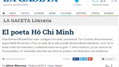 (VOVworld) – El periódico argentino La Gaceta publicó el domingo último un artículo de la destacada escritora Alina Diaconú sobre el presidente vietnamita Ho Chi Minh y sus poemas en el “Diario de prisión”.