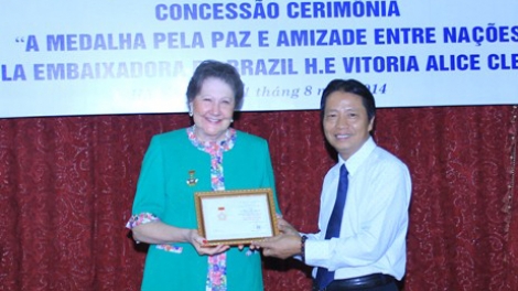 (VOVworld) – El presidente de la Asociación de Amistad Vietnam-Brasil, Nguyen Van Lang, concedió el jueves la Medalla Conmemorativa “Por la Paz y la Amistad entre los Pueblos” a la embajadora brasileña Vitoria Alice Cleaver, quien pronto terminará su misión en Vietnam.