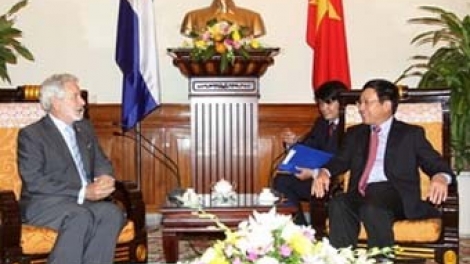 (VOVworld) - El canciller vietnamita, Pham Binh Minh recibió este miércoles a su par nicaragüense, Samuel Santos López en ocasión de su visita a este país para participar en el Foro Vietnam-América Latina sobre el Comercio y la Inversión, celebrado desde hoy hasta el 7 de julio. Minh resaltó la consideración de la nación sede de robustecer las relaciones de amistad y cooperación con Nicaragua.