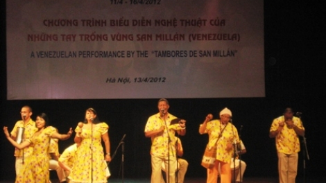(VOVworld) - La vibrante percusión y el ritmo de las canciones presentadas por el grupo venezolano "Tambores de San Millán" dejaron una impresión especial para el público hanoiyense que lo presenció anoche en el Teatro de Trabajadores, en Hanoi. Este espectáculo forma parte de las actividades de la semana cultural de Venezuela en Vietnam, auspiciado por la embajada de ese país en Hanoi y el Centro de Artes Escénicas, del Ministerio vietnamita de Cultural, Deporte y Turismo.