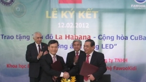 (VOVworld) - El Ministerio de Ciencia y Tecnología de Vietnam y la compañía Fawookidi firmaron el 12 de febrero en la Zona de alta tecnología de Ciudad Ho Chi Minh un acuerdo para entregar pantallas lumínicas Leds a la capital cubana de La Habana. Según dicho acuerdo, Vietnam y la empresa FawooKidi realizarán juntos el proyecto “Presentes vietnamitas 2012”, de ello, entregará a Cuba 60 conjuntos de Leds de alta tecnología valorados en más de 80 mil dólares.