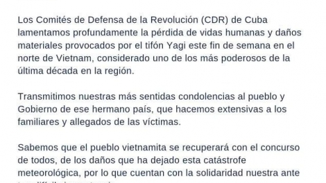(VOVWORLD) - La Dirección Nacional de los Comités de Defensa de la Revolución de Cuba (CDR) mostró su confianza en que con el esfuerzo de todo el pueblo Vietnam se recuperará de los daños causados por el tifón Yagi, según publicó la Agencia Vietnamita de Noticias (VNA).
