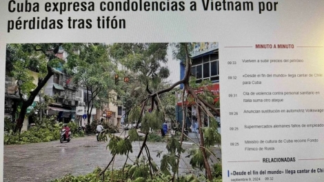 (VOVWORLD) - El presidente de Cuba, Miguel Díaz-Canel, transmitió hoy las más sentidas condolencias al pueblo, al Partido Comunista y al Gobierno de Vietnam, por las pérdidas de vidas humanas y los daños materiales provocados por el tifón Yagi.