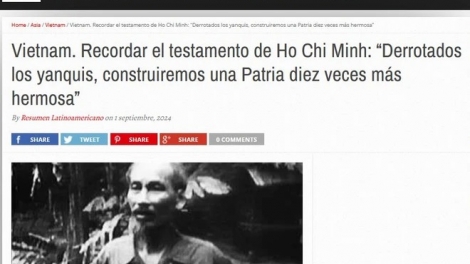 (VOVWORLD) - La página web argentina Resumen Latinoamericano publicó varios artículos sobre el presidente Ho Chi Minh, así como las actividades celebradas en Vietnam en conmemoración del 55.° aniversario de la puesta en práctica de su testamento.