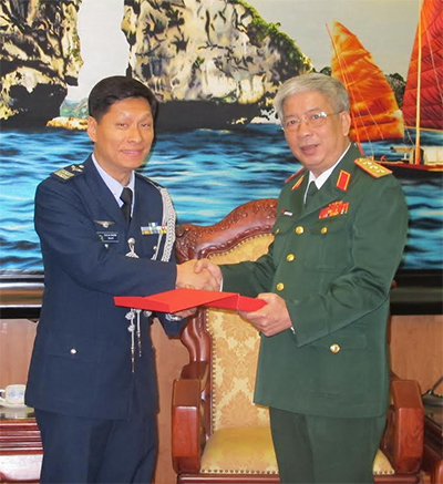 El coronel Vicent Dang entrega un recuerdo al viceministro de Defensa