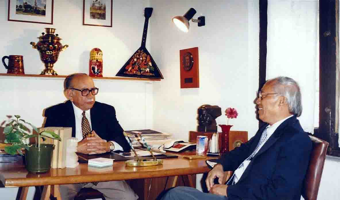 El periodista Nguyen Van Thin, en una conversación con Clodomiro Almeyda, ex canciller del presidente Salvador Allende, durante su regreso a Chile en 1996. (Fotografía de cortesía de Patricia Abarzúa) |