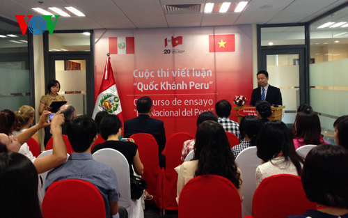 (VOVworld) – En ocasión de las Fiestas Patrias del Perú, el 28 de julio de 1821, se inauguró este viernes en Hanoi un concurso de ensayo sobre ese país andino de América del Sur. Participaron en el acto jóvenes capitalinos y diplomáticos extranjeros, entre otros visitantes. En su discurso pronunciado en la ceremonia inaugural, Le Cong Tien, vicejefe del Departamento para los Asuntos de las Américas, adscrito a la Cancillería de Vietnam informó que la celebración del certamen coincide el aniversario patrio 193 de Perú, los 20 años del establecimiento de las relaciones diplomáticas entre Hanoi y Lima, el 11 de noviembre de 1994, y la inminente inauguración oficial de la embajada de Perú en Vietnam.