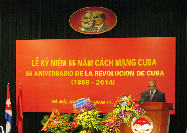 Por su parte, el embajador cubano en Vietnam, Herminio López Díaz, agradeció el apoyo y la solidaridad del pueblo vietnamita para el pueblo cubano durante los últimos 55 años, especialmente contra el bloqueo económico y financiero de Estados Unidos, así como por la liberación de antiterroristas cubanos en prisiones estadounidenses. El embajador resumió los logros relevantes del Partido, Estado y pueblo cubano en el año pasado, sobre todo en lo socioeconómico: “2013 fue un año de avance para el pueblo cubano, esforzándose en materializar la actualización del modelo económico, aprobado en el sexto Congreso del Partido Comunista de Cuba, celebrado en 2011. El Producto Interno Bruto creció al 2,7% y aunque fue, debido a dificultades diversas, inferior al 3,6% planificado, representa que la economía mantuvo una tendencia favorable al crecimiento. Con relación al 2012, la mayoría de las actividades económicas han mostrado incrementos, hubo un uso más eficiente de energía y la balanza comercial de bienes y servicios cerró con un saldo positivo”.