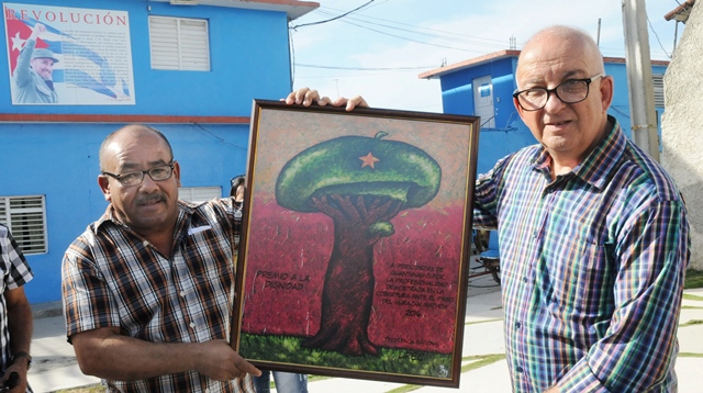 A la izquierda, el presidente de la UPEC en Guantánamo, dedicó en nombre de sus colegas, el Premio a la Dignidad, que recibieron por su labor durante el paso del huracán Matthew