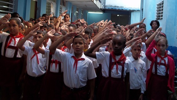 Los pioneros corean el himno de su escuela, obra en la que resaltan los nombres de Fidel, Ho Chi Minh y Vietnam