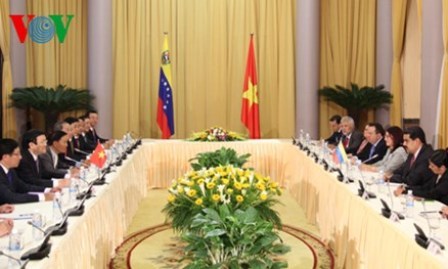 A su vez, el presidente Truong Tan Sang dijo que Hanoi está dispuesto a compartir con Caracas los logros y obstáculos que enfrentan en el proceso de “Doi Moi” (Renovación) durante las últimas tres décadas. Dio las gracias al gobierno venezolano por apoyar a su país en los foros internacionales, entre ellos, la ONU, el Movimiento de Países No Alineados y el Foro de Cooperación entre Asia Oriental y América Latina. Después de las conversaciones, los dos presidentes dieron una conferencia de prensa conjunta. Truong Tan Sang, dijo: “Nos pusimos de acuerdo para mejorar la eficacia de los mecanismos de cooperación vigentes. Los organismos competentes de ambas naciones revisarán y complementarán los acuerdos firmados para perfeccionar el marco jurídico bilateral. Ambos gobiernos crearán condiciones favorables para que las empresas lleven a cabo en las mejores condiciones posibles, sus proyectos de cooperación en energía, petróleo, industria, agrícultura y construcción, entre otros sectores. Estoy convencido de que esta visita solidifique aún más los lazos bilaterales para responder a las aspiraciones de ambos pueblos y coadyuvar activamente al mantenimiento de la paz, estabilidad, cooperación y progreso en las regiones y el mundo.”