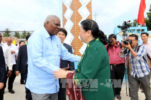 El presidente del Parlamento cubano, Esteban Lazo, saluda la vicetitular de la Asamblea Nacional vietnamita, Tong Thi Phong en la inauguración de la escuela de párvulos Moncada en la comuna de Luong Hoa, distrito de Giong Trom, en la provincia sur vietnamita de Ben Tre (Foto: VNA) |