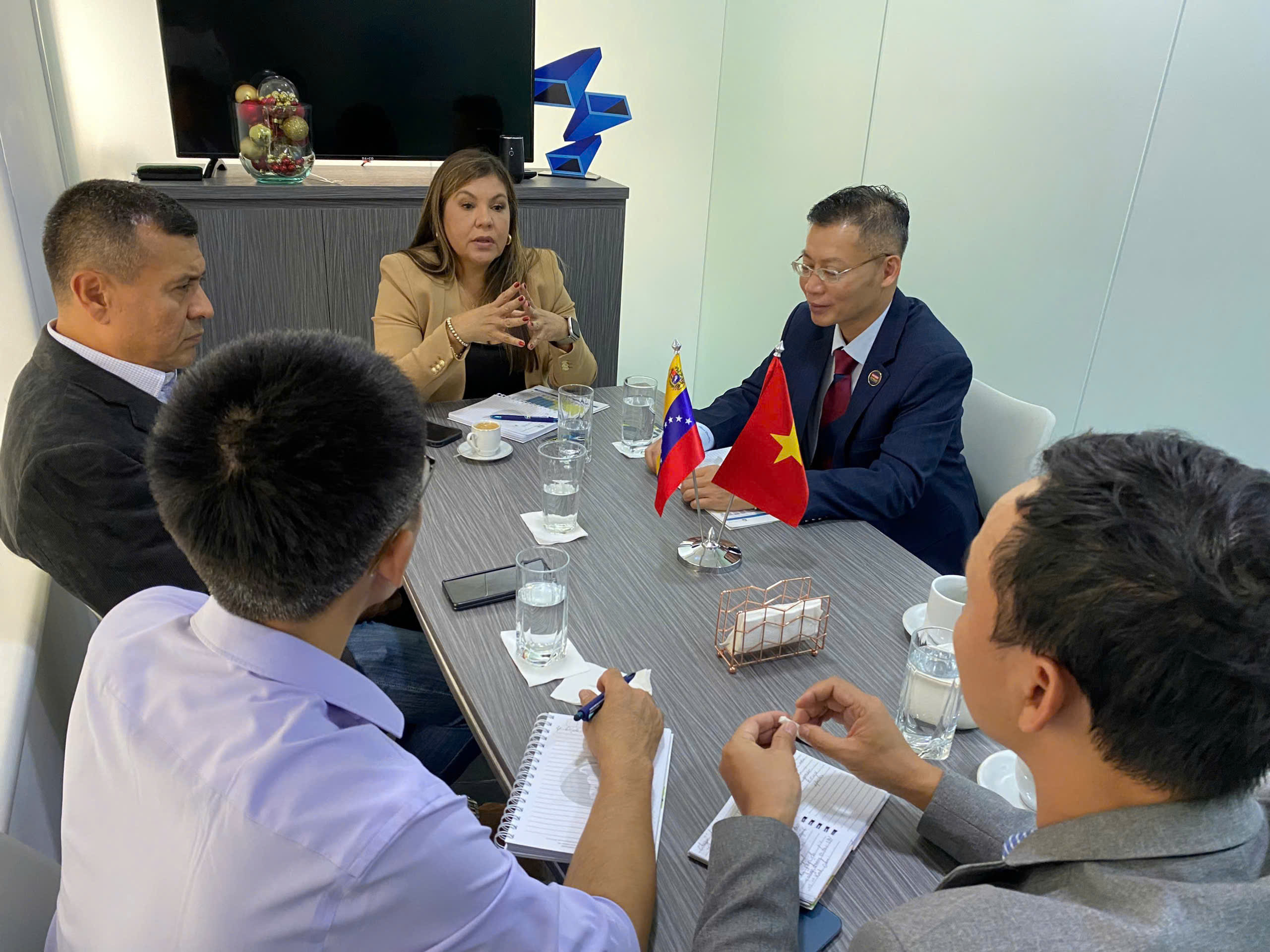 El director general de sociedad anónima de comercio e inversión Hola Amigo, Pham Hung Tien en la reunión con dirigentes de una empresa del Ministerio de Defensa de Venezuela durante su visita de trabajo en ese país sudamericano. (Foto: Hola Amigo) |
