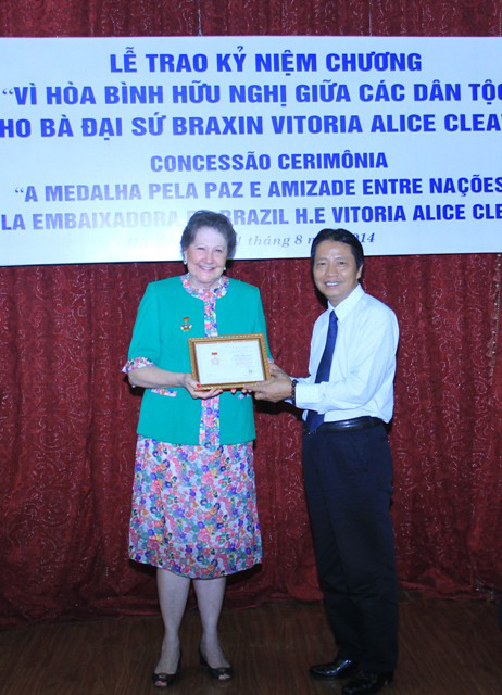 (VOVworld) – El presidente de la Asociación de Amistad Vietnam-Brasil, Nguyen Van Lang, concedió el jueves la Medalla Conmemorativa “Por la Paz y la Amistad entre los Pueblos” a la embajadora brasileña Vitoria Alice Cleaver, quien pronto terminará su misión en Vietnam.