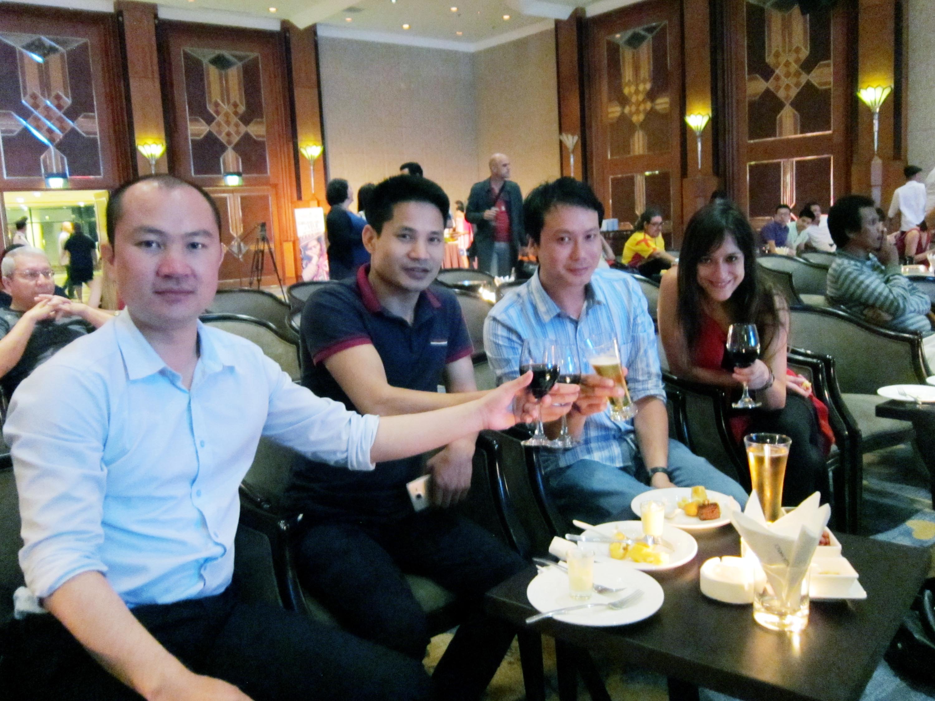 Amigos vietnamitas brindan con una aficionada al fútbol de España en el hotel Meliá Hanoi