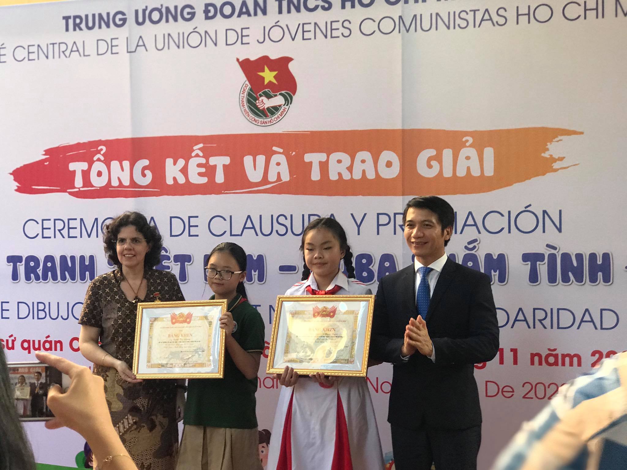 El secretario de la Unión de Jóvenes Comunistas Ho Chi Minh, Nguyen Ngoc Luong y la embajadora de Cuba en Hanói, Lianys Torres Rivera entregan certificados de reconocimiento a dos ganadores del primer premio del concurso. (Foto: VOV5) |