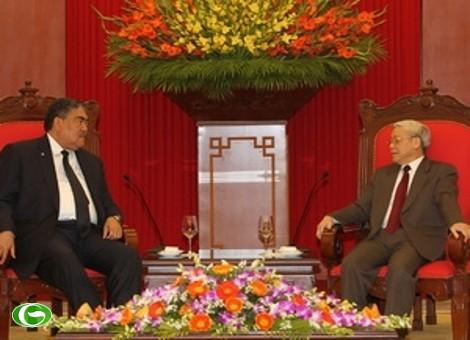 El secretario general del PCV, Nguyen Phu Trong, conversa con Jose Miguel Mejia, dirigente de izquierdas dominicanas