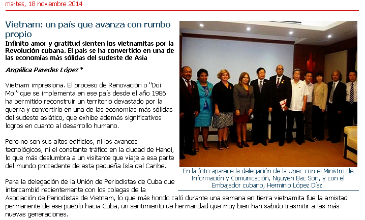(VOVworld) – Con el tema: “Vietnam: un país que avanza con rumbo propio”, el sitio Web de la Unión de Periodistas de Cuba publicó un artículo que elogia los logros de la renovación de Vietnam destacando la conversión de este país indochino de una de las economías más fuertes del Sudeste Asiático. Según comentó el autor, el proceso de Renovación o “Doi Moi” que se implementa en ese país indochino desde el año 1986 ha permitido reconstruir un territorio devastado por la guerra y convertirlo en una de las economías más sólidas del Sudeste Asiático, que exhibe además significativos logros en cuanto al desarrollo humano.