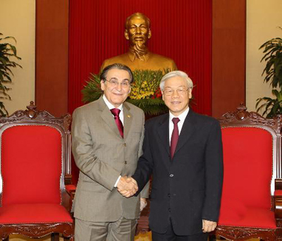 El Secretario general del PCV, Nguyen Phu Trong (d.) recibe al