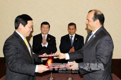 Las relaciones Vietnam- Perú experimentan progresos en los últimos años. En la foto: el ministro vietnamita de Finanzas y su homólogo peruano intercambiaron acuerdos de cooperación firmados en 2011 en la presencia de los presidentes de ambos países