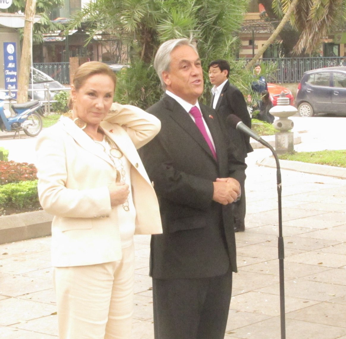 Piñera, tercer jefe de Estado chileno que visita Vietnam en menos de 10 años, valora la importancia de esta nación indochina para las aspiraciones de su país de acceder al creciente mercado asiático, como demostró el recién ratificado Tratado de Libre Comercio entre ambos países. En un breve encuentro con su comitiva de prensa, al cual tuvo acceso la Voz de Vietnam, el mandatario esbozó los intereses de su visita a Vietnam, Surcorea y Japón: "Estamos iniciando una importante visita a Vietnam, Surcorea y Japón, que son socios muy importantes de Chile. Nuestras exportaciones a estos tres países superan los 14 mil millones de dólares, y además con Vietnam acabamos de firmar un tratado de libre comercio, y por tanto el potencial con este país de 90 millones de habitantes y que está incorporándose al mundo, es muy promisorio. Además de las relaciones económicas, comerciales, también vinimos a buscar nuevas inversiones para nuestro país, especialmente en el campo de las energías limpias, renovables, pero también queremos que en esta visita podamos estrechar los lazos con la comunidad de países del Asia-Pacífico, que es una comunidad que va a significar para Chile más oportunidades, mejores empleos, mejores salarios, más progreso, y por eso esta visita espero que sea fecunda para Chile y para la calidad de vida de los chilenos".
