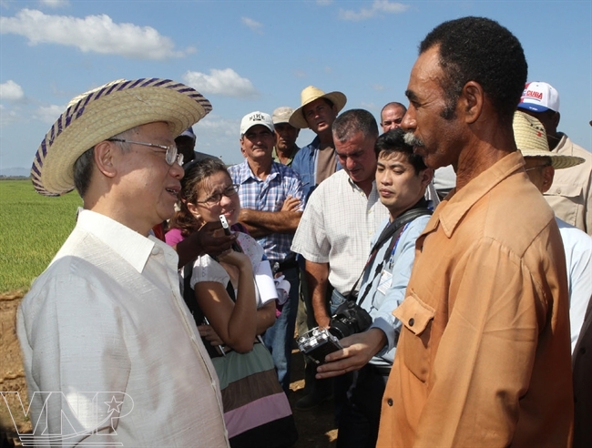 El líder partidista vietnamita conversa con un agricultor cubano en el