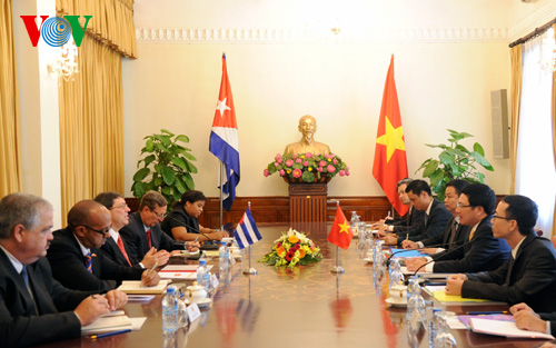 Con antelación, el viceprimer ministro y canciller vietnamita, Pham Binh Minh, sostuvo conversaciones con el visitante cubano. Ambas partes acogieron con beneplácito el fortalecimiento de sus relaciones y se comprometieron a acelerar la aplicación de los acuerdos existentes y aumentar la eficacia de la comisión intergubernamental y los mecanismos sellados de colaboración, especialmente en comercio, agricultura, petróleo, biotecnología, medicina, productos farmacéuticos y telecomunicaciones. Cubanos y vietnamitas también acordaron celebrar con múltiples actividades, el próximo año, el aniversario 55 del establecimiento de relaciones diplomáticas entre los dos países.