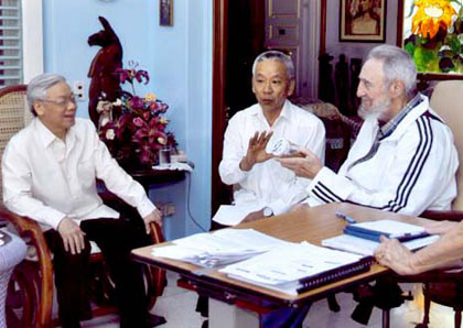 (VOVworld) - Durante su visita amistosa oficial en Cuba, Nguyen Phu Trong visitó al líder revolucionario cubano, Fidel Castro, ocasión en la que el dirigente vietnamita expresó su satisfacción por ver que Fidel se mantiene saludable.