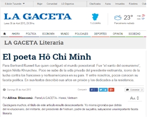 (VOVworld) – El periódico argentino La Gaceta publicó el domingo último un artículo de la destacada escritora Alina Diaconú sobre el presidente vietnamita Ho Chi Minh y sus poemas en el “Diario de prisión”.