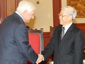 (VOVworld) - En el recibimiento de este jueves al presidente panameño, Ricardo Martinelli, en visita oficial a Vietnam, el secretario general del Partido Comunista, Nguyen Phu Trong, consideró el acontecimiento como un importante hito en las relaciones bilaterales. El líder partidista de Vietnam apreció los resultados logrados en las conversaciones entre Martinelli y su homólogo anfitrión, Truong Tan Sang, en especial las orientaciones y medidas concretas para fortalecer la cooperación multifacética, sobre todo, en el comercio y el transporte marítimo. Por su parte, el presidente panameño expresó la convicción de que su periplo por Vietnam creará un nuevo impulso para los nexos entre los dos países. Ambas partes acordaron organizar actividades conjuntas, promover el intercambio entre los dos partidos gobernantes, parlamentos y pueblos.