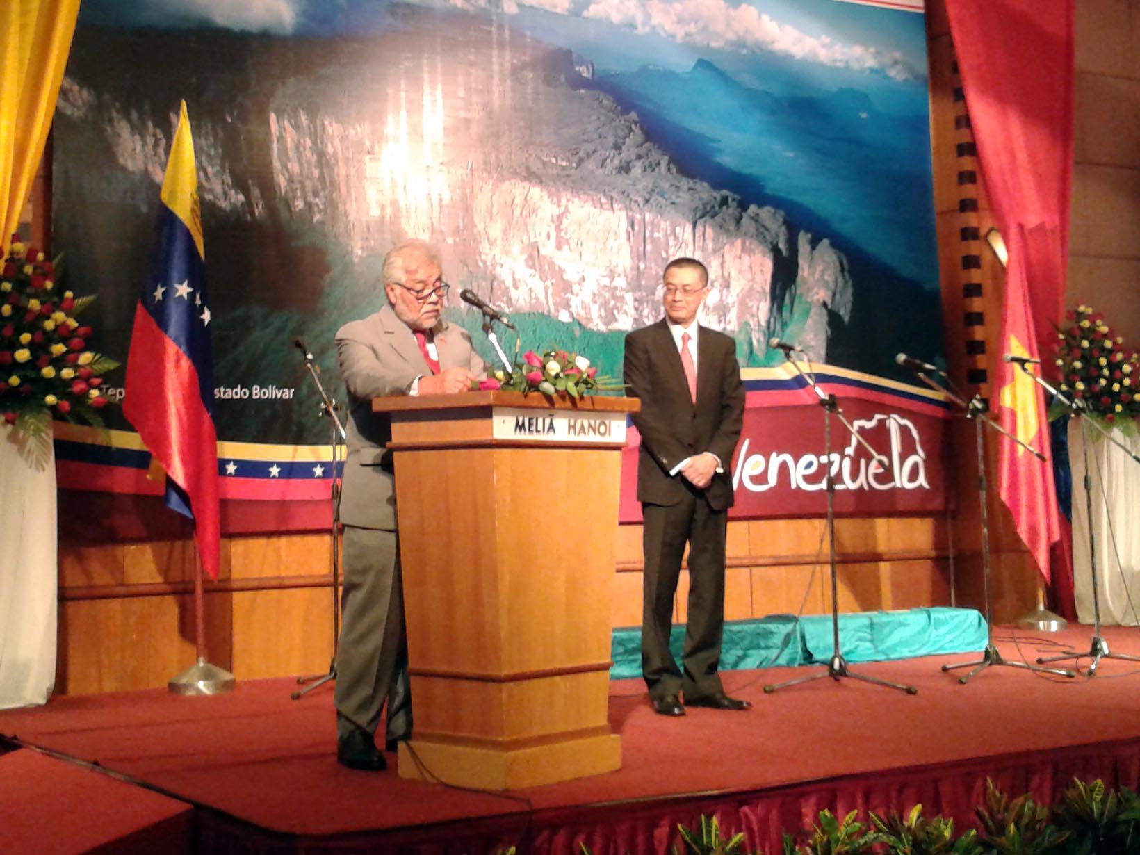 ![]() El embajador de Venezuela en Vietnam, Jorge Rondón Uzcátegui (i) y el asistente del ministro de Relaciones Exteriores de Vietnam, Vu Quang Minh