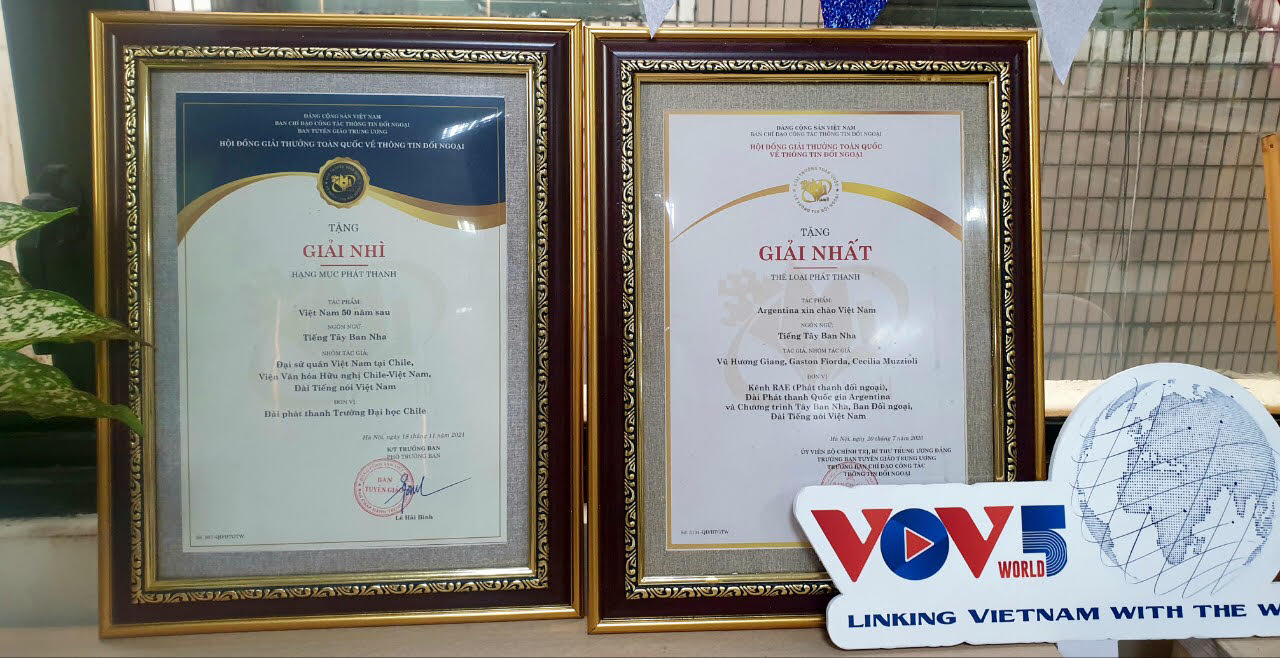 En 2021, con el aporte de nuestro Servicio, también fue distinguida con segundo galardón del Premio Nacional de Información al Exterior, en la misma categoría, la obra “Vietnam, 50 años después”, realizada por la Radio UChile con motivo del 50 aniversario de las relaciones diplomáticas entre Vietnam y Chile. El periodista Gastón Fiorda de la Radio Nacional Argentina, evaluó lo siguiente: “Un ciclo que se denomina Argentina Saluda a Vietnam, Vietnam Saluda a Argentina, fue premiado también por el gobierno de Vietnam, en la categoría de información al exterior, en el rango de la radio. Todo el tiempo se elaboran los contenidos que nos envían los amigos y profesionales de la Voz de Vietnam, mes a mes, con toda la información sobre los lugares más emblemáticos de Vietnam, con los artistas populares, musicales, más reconocidos que tiene la República Socialista de Vietnam. Lo que en Argentina no se conocía hasta antes de que se hiciera este intercambio, ahora hay mucha gente en nuestro país, en Argentina, que ya conoce los lugares más emblemáticos de Vietnam, que conoce a los artistas, y todo gracias al trabajo que se viene realizando hace cinco años, puntualmente con la sección en español, que tiene la Voz de Vietnam, y repito con profesionales de altísimo nivel y grandes personas”.