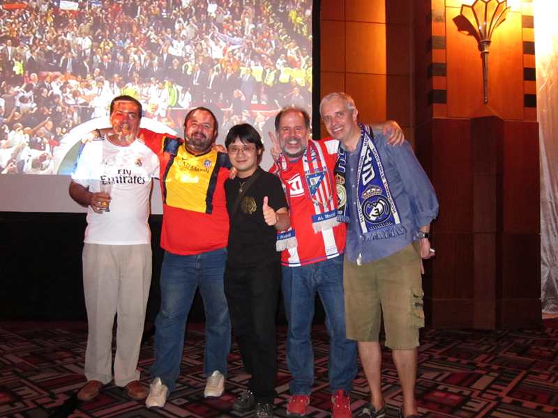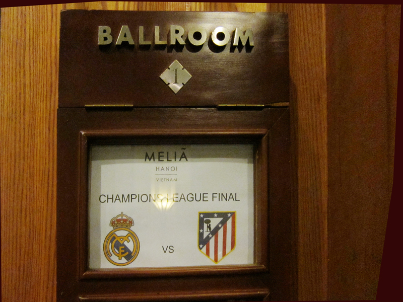Unos 100 españoles residentes en Vietnam se dirigen a la sala de fiestas del Hotel Melia Hanoi que tiene capacidad para recibir a 360 personas. Todos se concentran en una pantalla de 300 pulgadas colgada en la pared. En ambos lados de la misma, se encuentran banderas de los clubs Real Madrid y Atlético de Madrid, respectivamente, dos equipos que van a competir dentro de media hora. En la puerta, Alfonso Echavarría Lozano, trabajador de la empresa de viaje y turismo Travex recibe con entusiasmo a los últimos invitados, entre ellos el ingeniero en construcción civil, Javier, partidario del Atlético de Madrid. El hombre declaró con seguridad: “Dos a uno a favor de Atlético de Madrid. Empezará a marcar gol Madrid y después Atlético de Madrid marcará otros dos goles”.